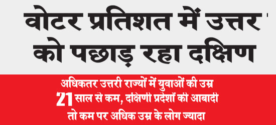 भारत में मीडियन एज 29 साल के आसपास है यानी लगभग आधी जनसंख्या की औसत उम्र 29 साल से कम है लेकिन राज्यों के स्तर पर मीडियन एज में काफी फर्क है। यूपी, बिहार जैसे उत्तर भारत के अधिकतर राज्यों में आबादी अधिक है और इसमें काफी युवा लोगों की उम्र 21 साल से कम है। दक्षिण के प्रदेशों की आबादी तो कम है ही, वहां अधिक उम्र के लोग भी ज्यादा हैं। इसलिए वहां आबादी में वोटरों का हिस्सा भी अधिक है।